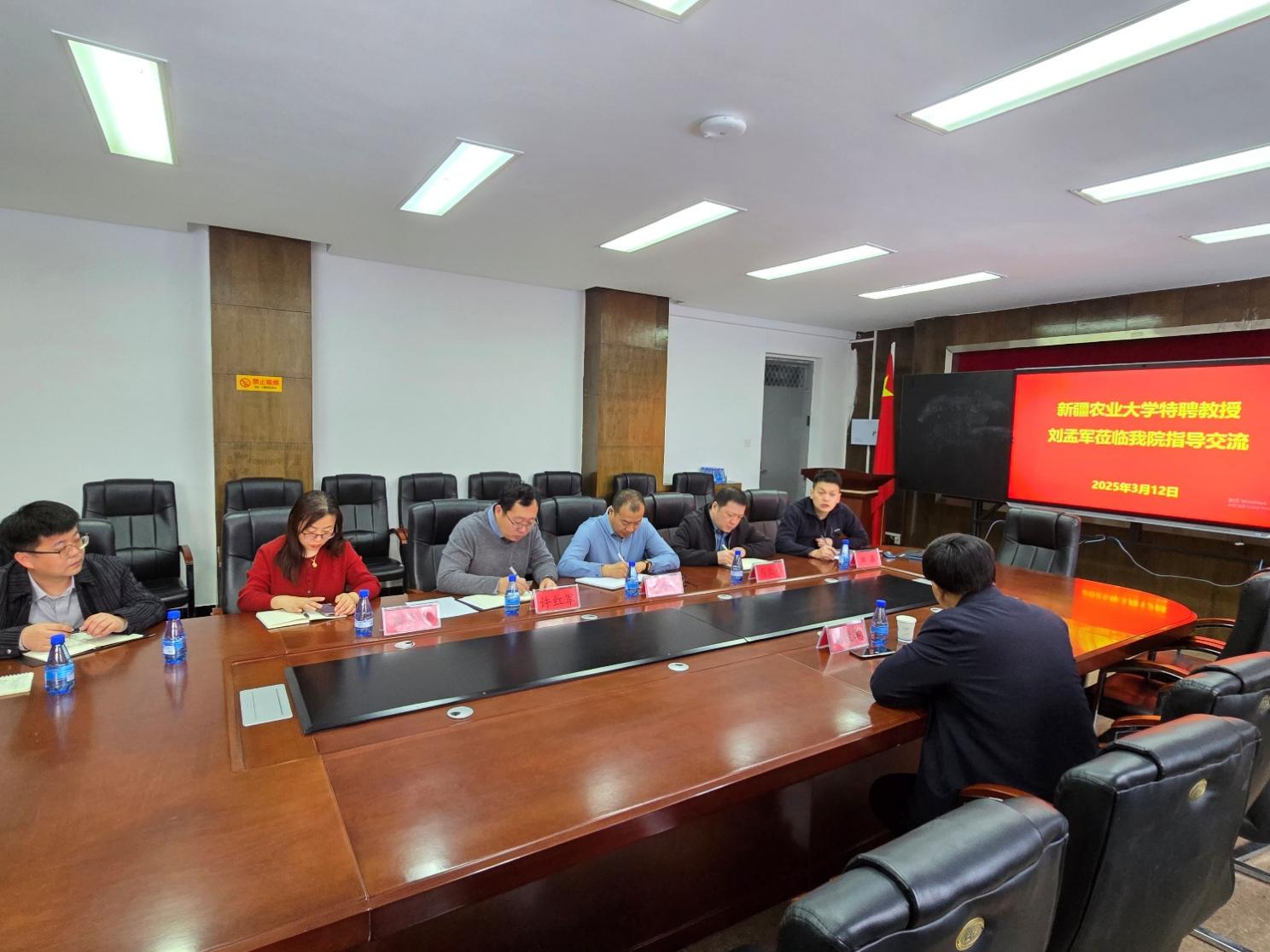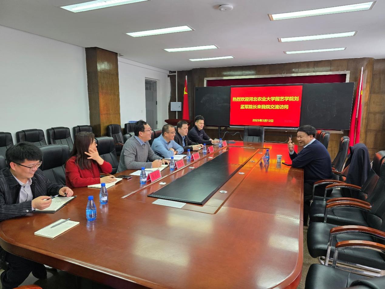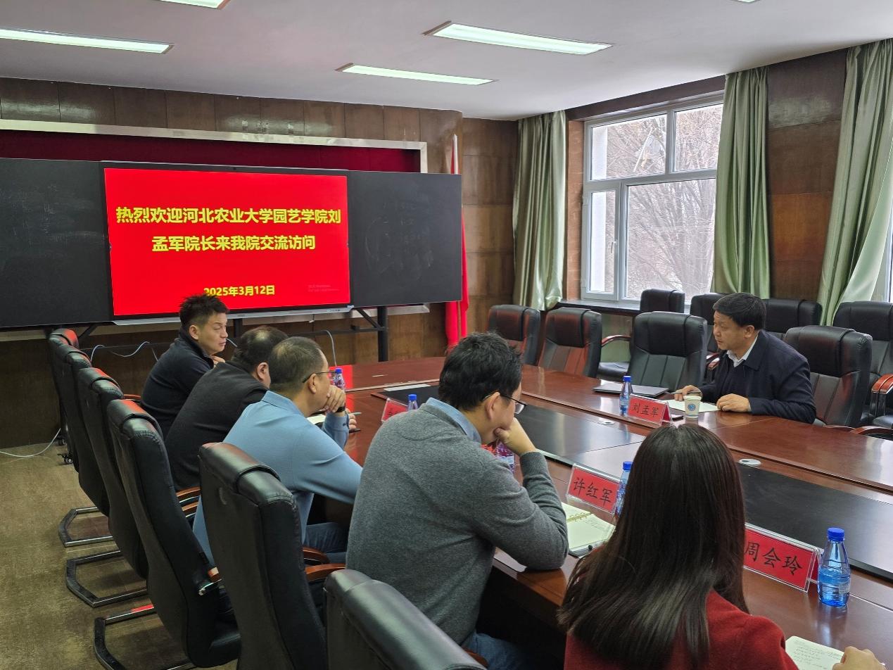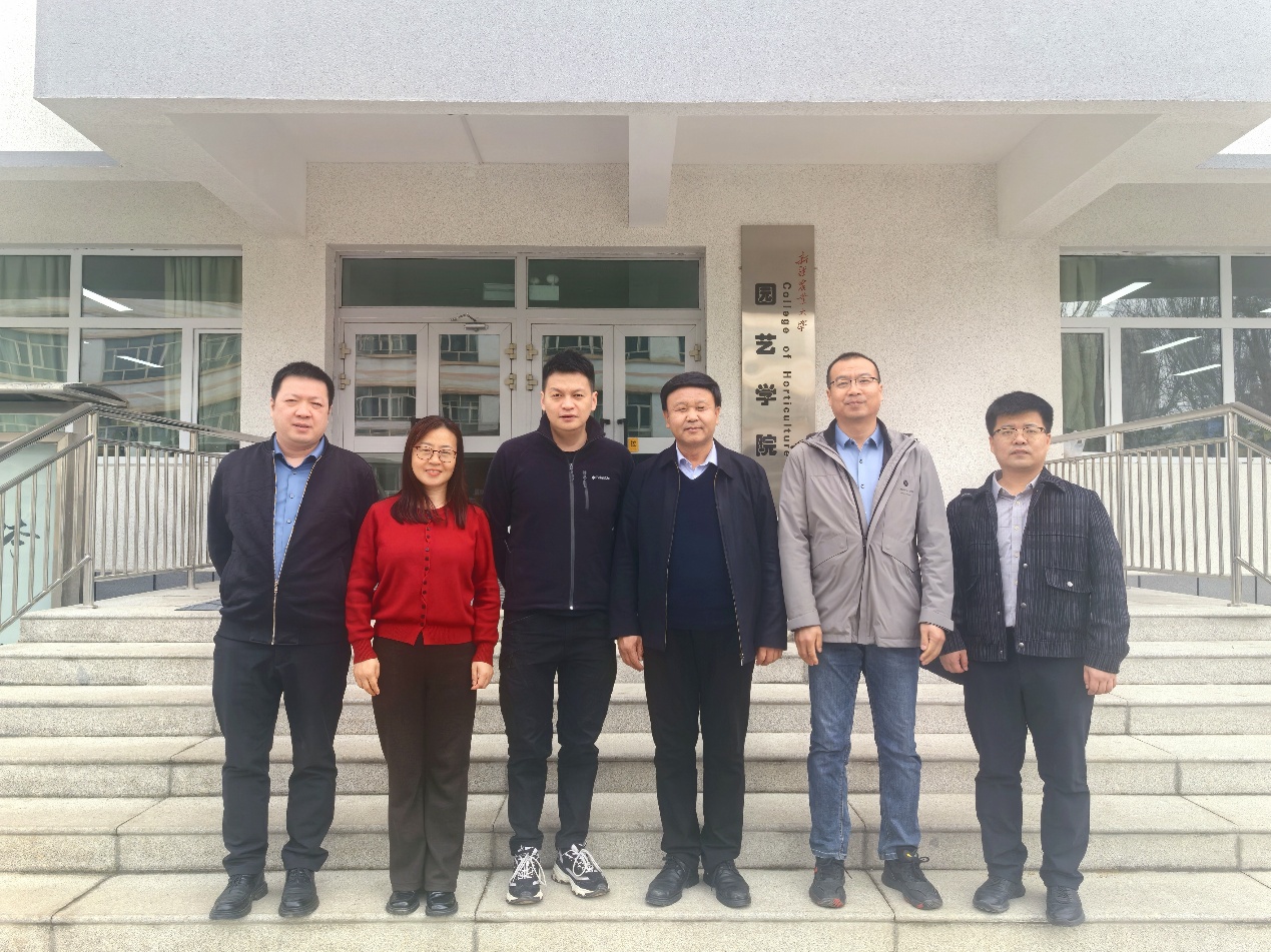 3 月 12 日上午,河北农业大学园艺学院院长刘孟军来新疆农业大学园艺学院交流访问,学院党委委员李志强、副院长许红军、党委副书记马业光、副院长田嘉、周会玲 (援疆)全体领导班子成员会见并进行座谈。